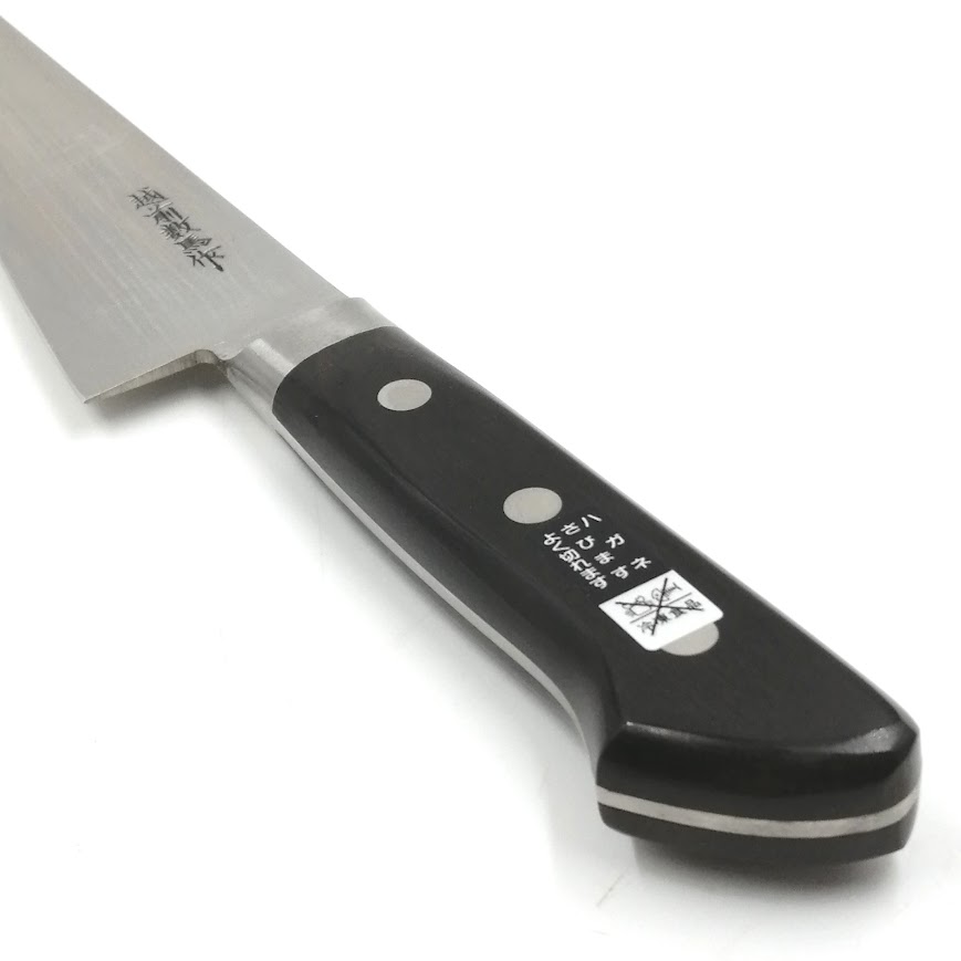 • 柄材は耐久性に優れた積層強化合板使用した口金とブレードの接合部から水が入らない完全溶接の共口金(ツバ付き)タイプなので、水垢も溜まりにくく、いつも清潔にご使用頂けます。包丁のナカゴは本通しになっておりますので、バランスが良く扱いやすい包丁です。