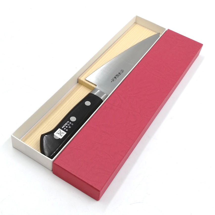 • 元々は骨から肉を切り剥がす特殊包丁です。牛刀と比べると厚みがあり刃こぼれしにくい作りになっています。また先端が尖っており、骨と肉の隙間に入り込みやすいので、肉以外にも、魚を捌いたりも出来るので便利な1本です。