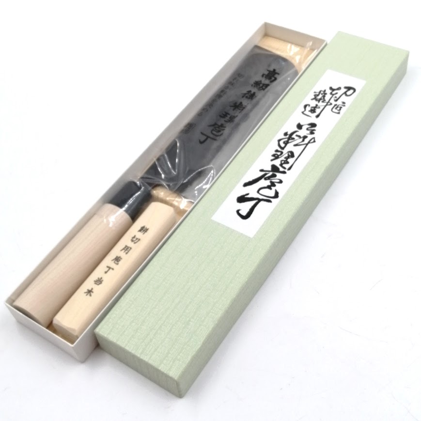 • 餅などの硬い物を切る為の頑丈な包丁ですが、当て木を使わなければ、大きめな葉物野菜も一回で切れる大変便利な包丁としてもご利用頂けます。