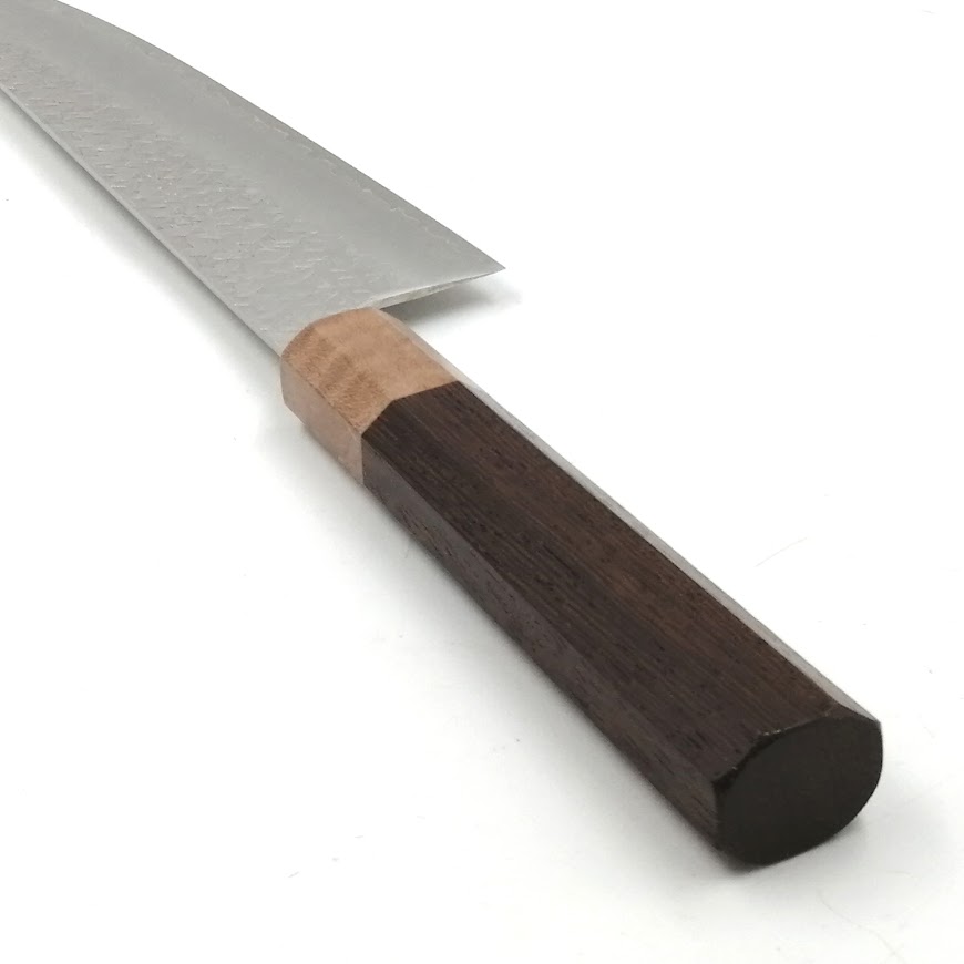 • 柄の部分は、ハンドル部は美しい木目で腐食にも強く、非常に硬い唐木三大銘木の一つの鉄刀木の八角柄を使用し、柄と包丁を繋ぎ彩る口輪はやさしい色味のラテカラーのスタビライズウッドを合わせました。落ち着いた色味で新しさと懐かしさが共存する柄を合わせました。