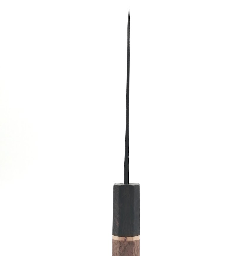 • 非常にシンプルですが、刃肌にしっかりと鍛造跡が残っており、火づくり鍛造の妙を感じる事が出来ます。柄には落ち着いた色味ながらポップなデザインの八角柄を合わせる事で、黒打の重厚感のある刃と調和のとれた1本に仕上げました。