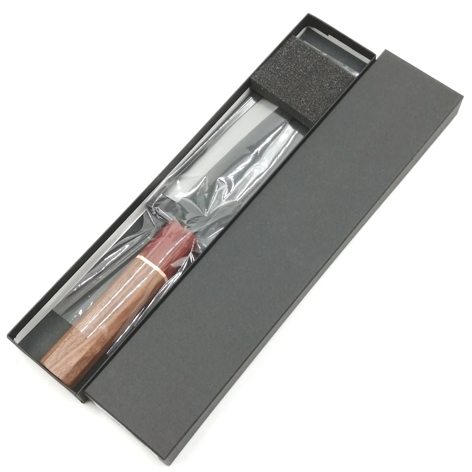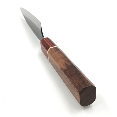 • 鋼は使い始めの切れ味が長く続き、切れ味が落ちて研ぎ直す際、比較的簡単に研げる白二鋼を使用しています。『両刃×八角柄』で利き手を選ばないので海外の方のお土産にも人気な小包丁です。