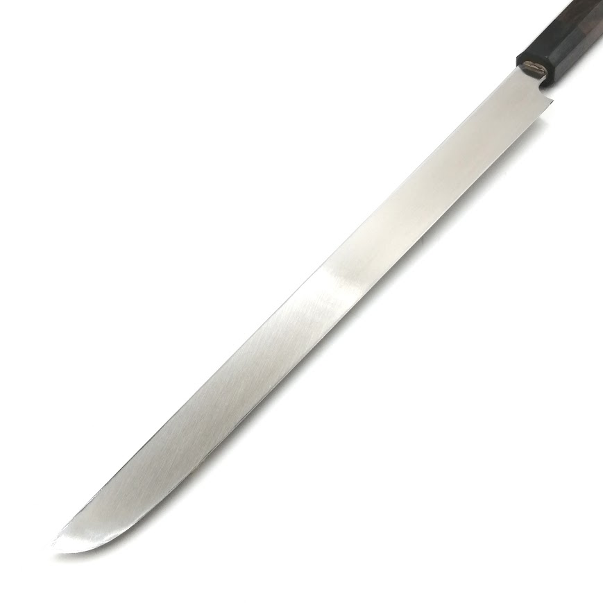 • 先丸型蛸引とは、刃幅が蛸引包丁のように細幅で、刃先が日本刀のようなフォルムなっている刺身を引く為の包丁です。切れ味の鋭い長い刃を活かし、身の軟らかい魚も繊維を崩さずに一刀で切り下ろすことができます。