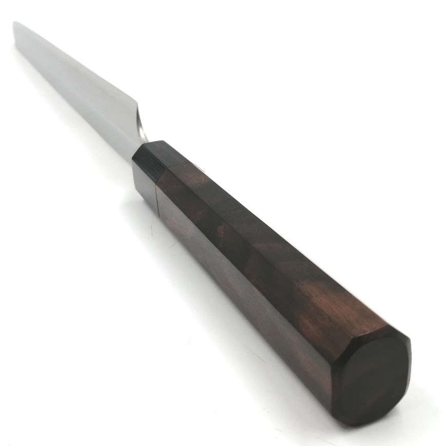 • 柄は、非常に密度が高く、硬くて重い「木のダイヤモンド」と称される黒檀の八角柄です。深い光沢と美しさに加えて、使う人にも優しく桂と母材との段差を無くした高級感のある柄を合わせました。